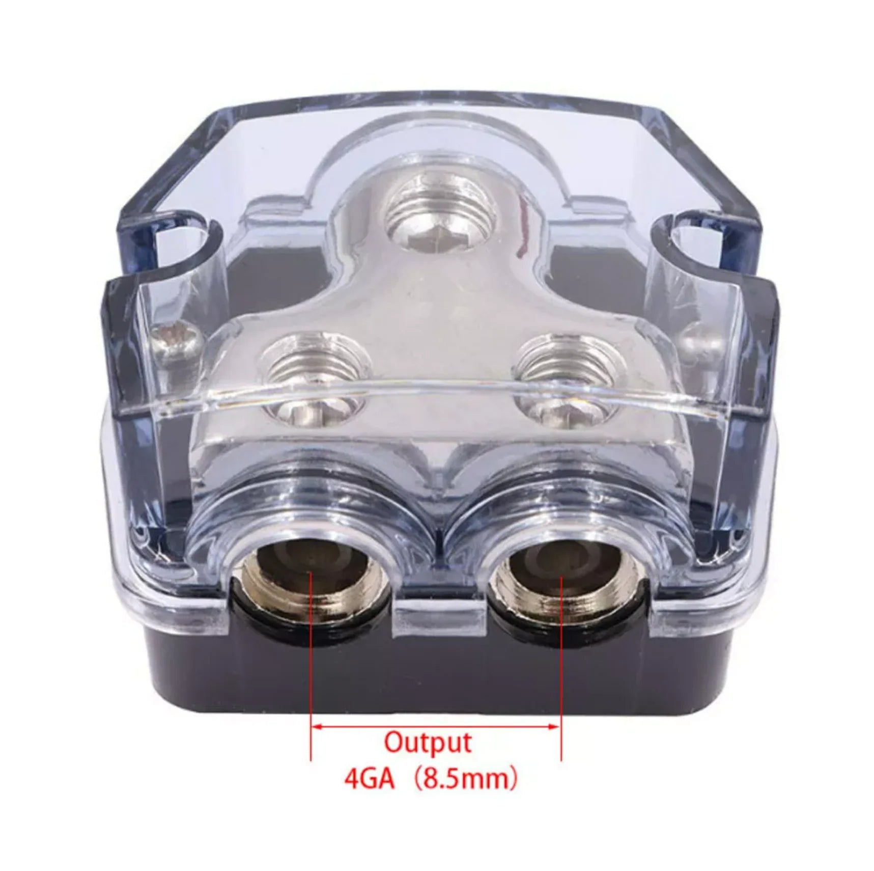 Featuring a 1-way input and 2-way output, this block supports a range of wire gauges, including 0/2/4 gauge for input and 4/8 gauge for output, making it highly versatile for various installations. Its durable zinc alloy construction ensures excellent conductivity, while its corrosion-resistant design guarantees long-lasting performance. The high-temperature polycarbonate base and impact-resistant plastic cover further protect the block, offering superior insulation and durability for your system.